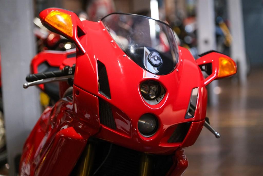 Here we have for sale a Ducati 999R MK1. This gorgeous example is a 2003 Mk1 example with 3,717 miles on the clock. The bike is #121 on the headstock and is in pristine, completely original condition. The bike has a good service history with the last service being carried out by Cornerspeed Ducati which did include the belts, brake fluid & coolant changed. When the bike leaves us for a new home it will benefit from another fresh service by us including belts, Brake fluid & MOT. Our bike does also have the Ducati leather wallet which includes both keys, Plaque, tool kit, ECU & bike cover.
