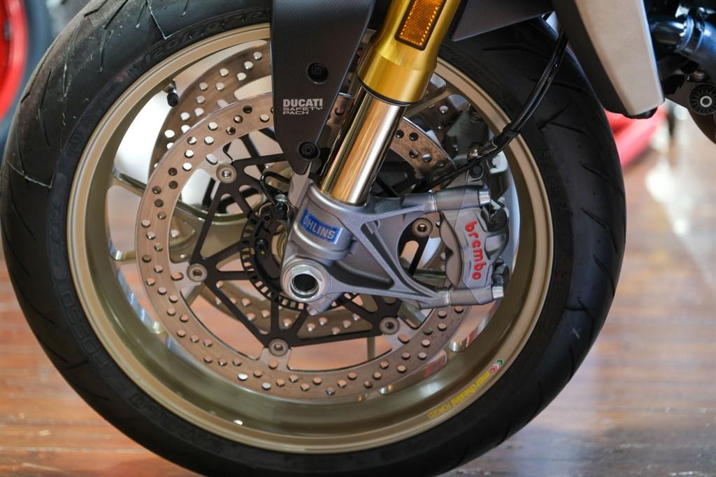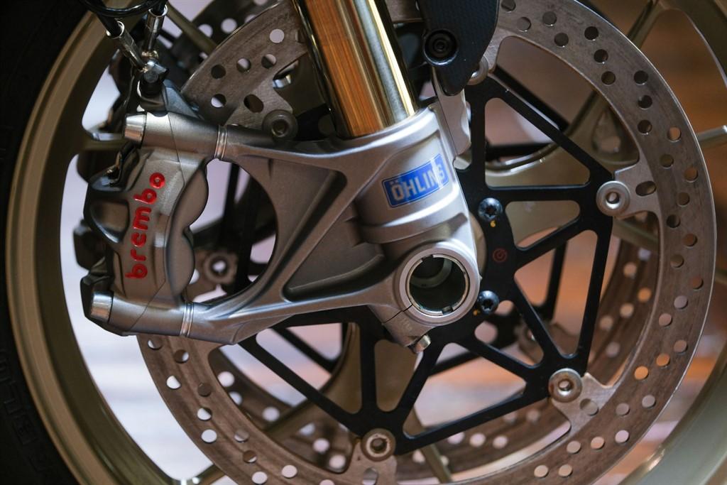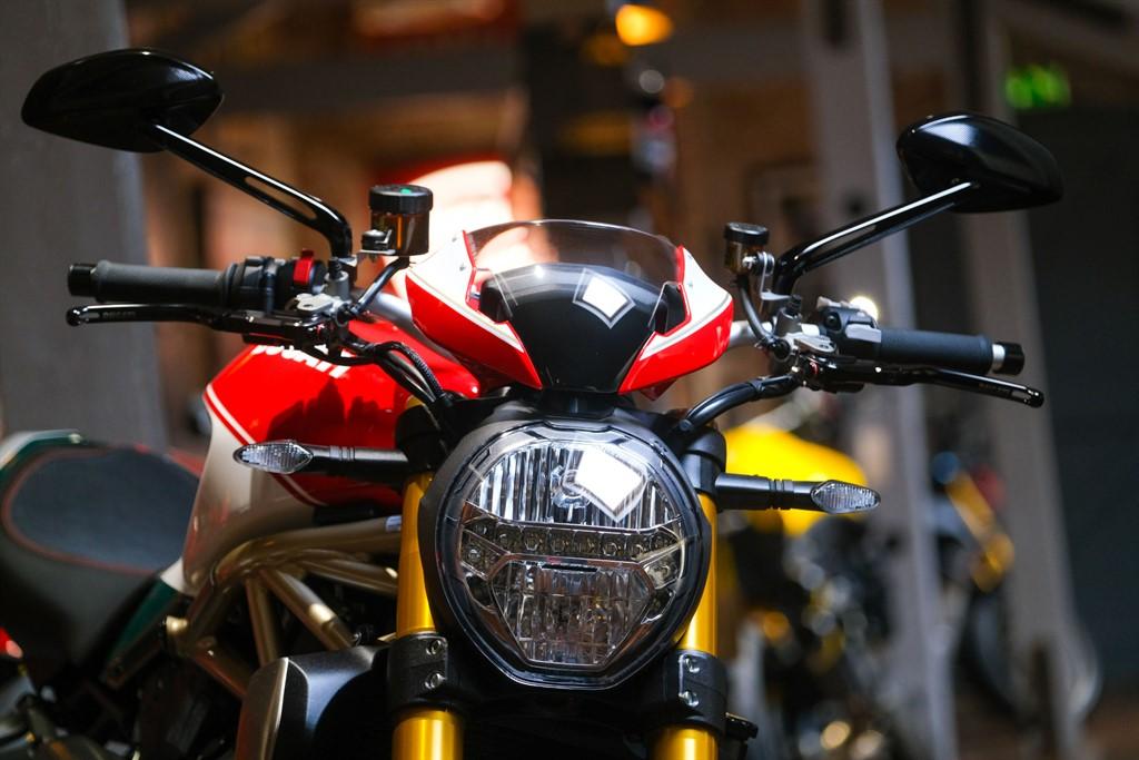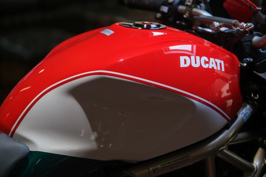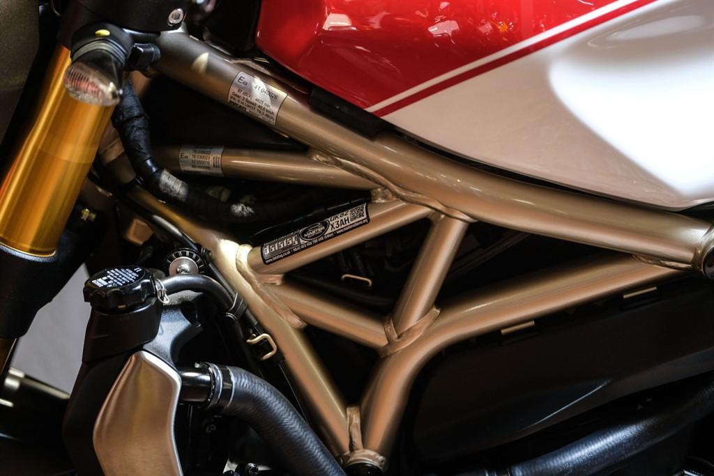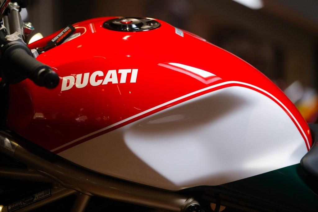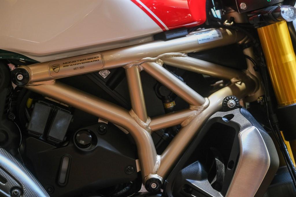 The headlight fairing, tank and passenger seat cover of the bike feature a special three-colour Italian flag livery inspired by the 2008 Monster S4RS Testastretta Tricolore. The line is also distinguished by a logo celebrating the bike's 25 years embroidered on the seat. It also boasts distinctive Marchesini forged rims with gold-coloured W spokes, a steel tube trellis frame and Öhlins fully adjustable suspension.