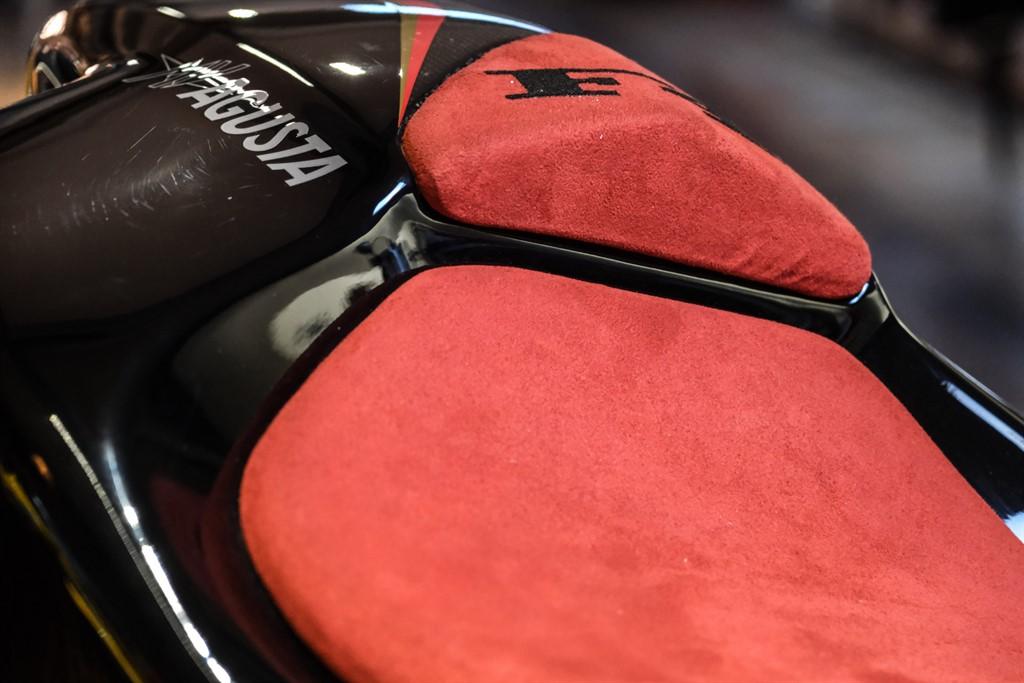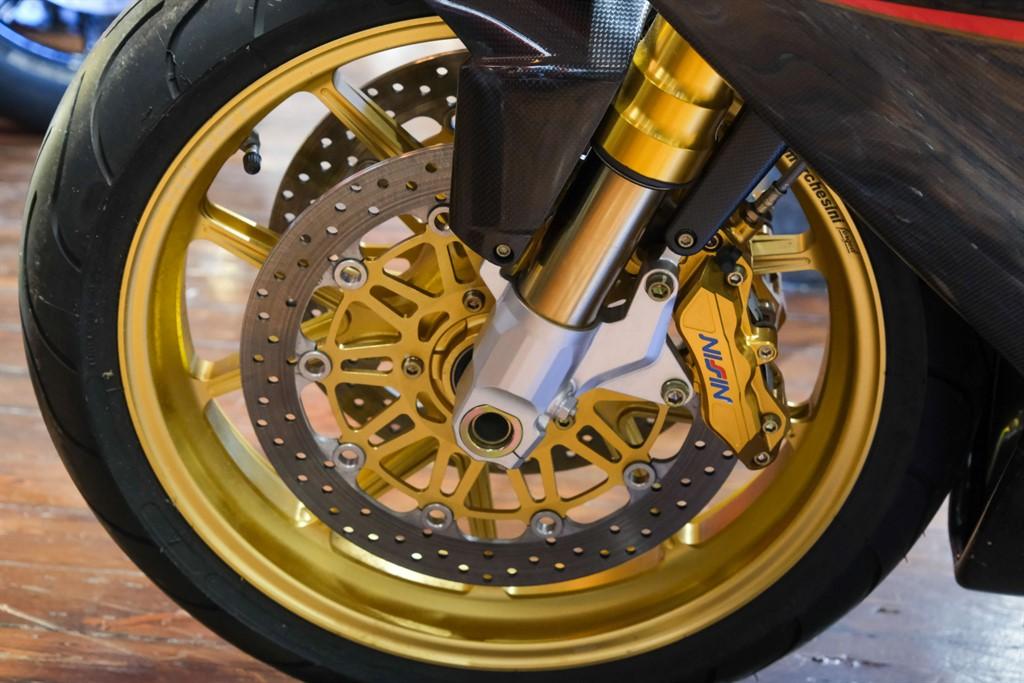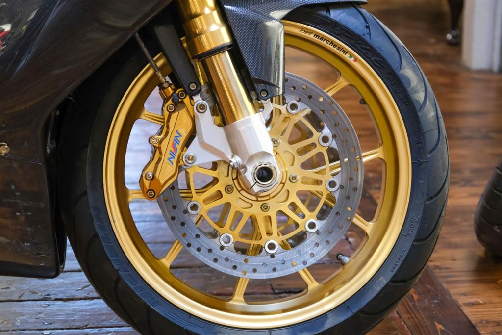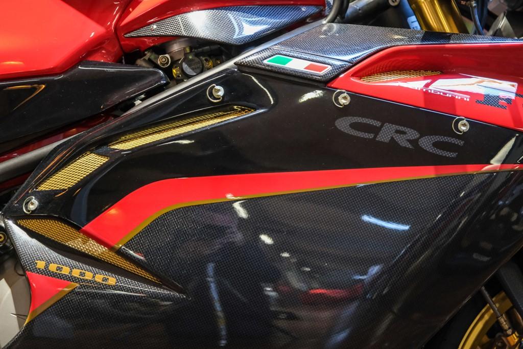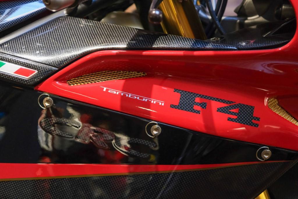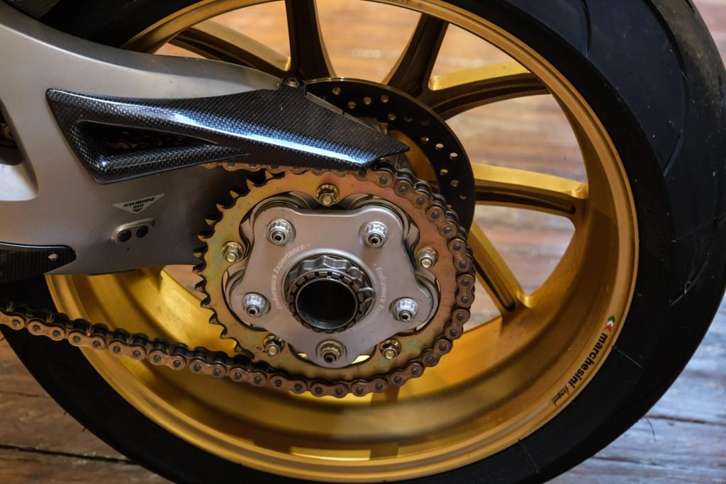 Even if you never ride this Tamburini, looking at it might be enough. Gold-toned mesh covers the fairing vent holes, while forged aluminum wheels are gold anodized to continue the theme, just as with the 6 piston billet Nissin front brake calipers. Aside from the fuel tank which is steel, the Tamburini's bodywork is nearly all carbon fibre, finished to a very high standard. A nice touch is the F4 and CRC logo work on the fairing sides that lets the c-f weave “peek” through the high-gloss paint. Who needs decals when the underlying material itself is so nice you simply leave paint off? The lower triple-clamp, frame sideplates and gorgeous single-sided swingarm are lightweight magnesium.