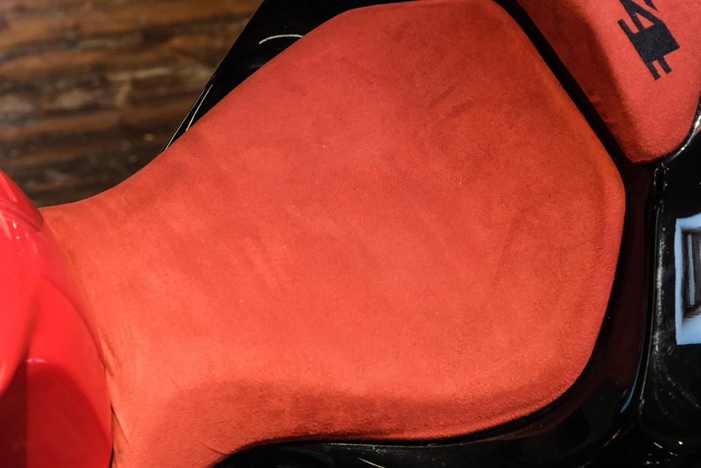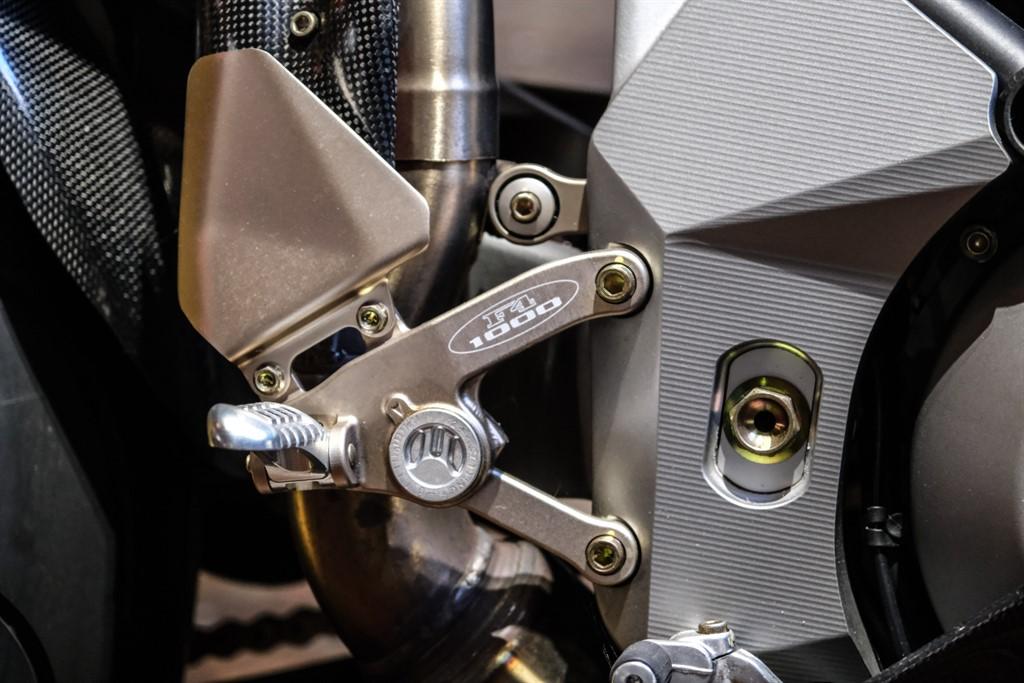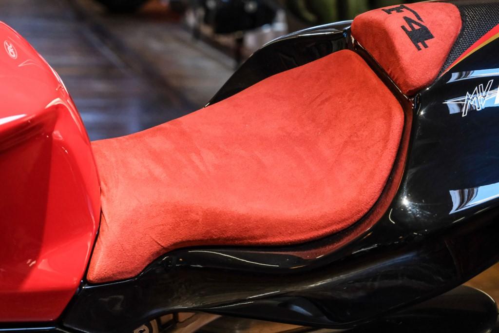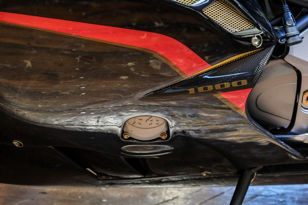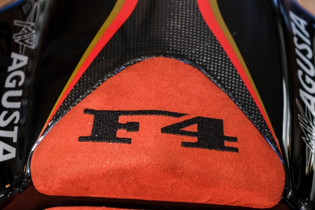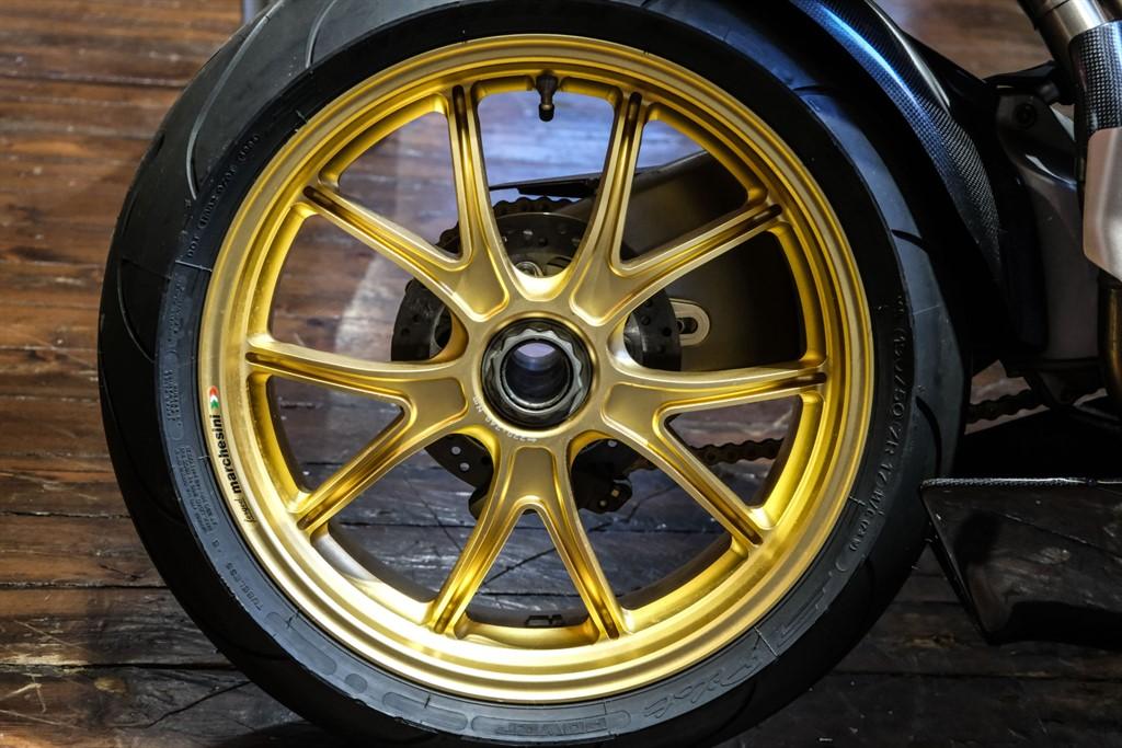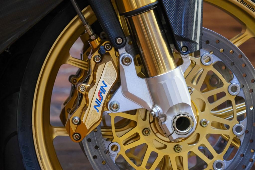 Even if you never ride this Tamburini, looking at it might be enough. Gold-toned mesh covers the fairing vent holes, while forged aluminum wheels are gold anodized to continue the theme, just as with the 6 piston billet Nissin front brake calipers. Aside from the fuel tank which is steel, the Tamburini's bodywork is nearly all carbon fibre, finished to a very high standard. A nice touch is the F4 and CRC logo work on the fairing sides that lets the c-f weave “peek” through the high-gloss paint. Who needs decals when the underlying material itself is so nice you simply leave paint off? The lower triple-clamp, frame sideplates and gorgeous single-sided swingarm are lightweight magnesium.